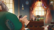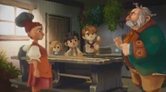 Ferinia shuts the door to her shop as she, Oskar and the children discuss what to do next. Oskar explains to the kids that the Fangs will be hunting them, so he has to hide them until he can smuggle them out of Glipwood. Janner points out that Ferinia said that the Black Carriage was coming, so when it does, they will never see Nia and Podo again. Ferinia says that it's true, and that if they have a move, then they make it tonight, but Oskar explains that they can't just stroll into a Fang jail to free the prisoners. Janner suggests that they lure the Fangs out, but Oskar tells him that the cell would be locked, so Tink suggests that they steal the keys, but Oskar points out that they don't have enough help. Leeli suggests that they ask their friends for help, but Oskar still thinks it will be impossible. Tink then suggests that they try something similar to an event in a book called "The Mildly Unpleasant Adventures of Nearly Eleanor" in which the gunkee wore Eleanor's cloak and tossed berrybuns from the tower. Oskar corrects him by saying that they threw plumyums, and he agrees by saying that it caused the grobblins to scurry away from their hole. Tink finishes by saying that the grobblins then swarmed the tower while Eleanor snuck into their hole and stole back the plotus. Oskar says that he sees Tink's point, but he can't let the children set foot in the jail. Seeing the kids' sad faces, he says that he'll do it. He tells Ferinia that they'll need her cunning. Ferinia pulls out a book and pen and points out that the Fangs have orders to arrest the Igiby children on sight, so they'll give them a sight.