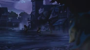 The Igibys return to their cottage to get supplies. Nia grabs some packs she kept hidden as the kids stare at their ransacked former home. The family load up their supplies into the wagon as Tink continues staring at the cottage, upset. As Podo loads the crate from Buzzard Willie into the wagon, he suddenly hears hissing and turns to see Slarb holding a blade up to Tink's neck. Podo says that they'll give Slarb anything he wants if he doesn't hurt Tink. Slarb demands that they give him the crate, and Podo obeys, sliding the crate towards Slarb. The Fang throws Tink to the ground and places his foot on the boy's head as he prepares to open the crate. To Slarb's surprise, there are several thwaps inside the crate, and when the thwaps see Slarb, they all start attacking him. Tink quickly runs to the wagon as Podo charges at Slarb and knocks the Fang away. Slarb quickly runs off, and Podo prepares to chase after him, but Nia tells him that they need to leave now, and she points at several lights heading towards town. Podo hops into the wagon and begins driving it away from the Cottage. The children cry as they leave, and Nia tries to comfort them. Podo looks back and tells Janner to have a stout heart. As they leave, the Fangs reach Glipwood.