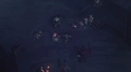 Outside, several townsfolk along with Mayor Blaggus are conversing about what had just happened. When they see the family, Shaggy asks what happened inside, and Podo explains that Oskar was stabbed by Zouzab, but Oskar is most likely going to survive. A woman asks them why they attacked the Fangs, and eventually all the townsfolk start asking them questions and rebuking them. Podo tells them that they didn't mean to start trouble, and that if there is anyone to blame, it's Gnag the Nameless. He then explains to the townsfolk that they plan to be long gone before the Fangs arrive and that everyone should do the same. The townsfolk begin returning to their homes, and Shaggy then says that he's going to stay and that bibes are free for anyone else who stays. Buzzard Willie walks over to Podo with a crate and apologizes to Podo for stealing Merna Bidgeholler from him, and he gives Podo the crate. Podo thanks him and says goodbye to Buzzard Willie. Ferinia pulls up in a wagon and tells the Igibys that she got them a ride out of town.